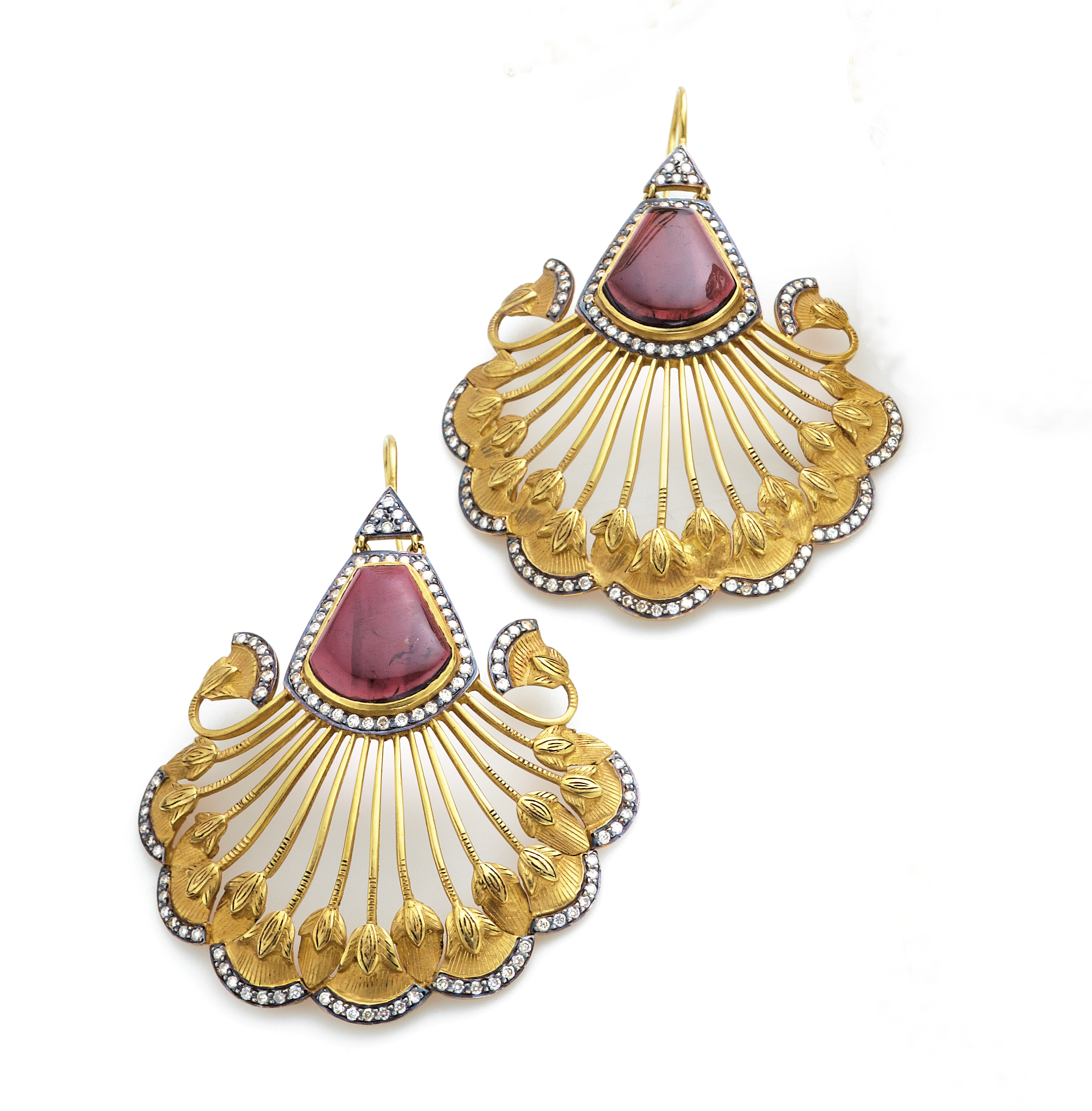 Earrings: My personal favorites this season are these beautiful Amrapali Gold Fan earrings with Diamonds and Pink Tourmaline stones – price $5960. Available: (by appointment) at Amrapali New York showroom 212-944-0435