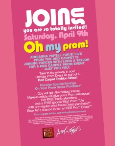 The event will feature 25% savings on a prom dress, basic free alterations and a gift tote filled with prom night goodies, with any regular-priced prom dress purchase. Select location will create an in-store pre-prom atmosphere complete with DJ, Make-up makeovers, Paparazzi and red carpet fashion show.