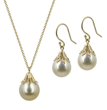 From: Baggins Pearls –14k Yellow Gold Earrings and Pendant with a delicate filigree-style setting set with 10 – 12mm Champagne South Sea Pearls suggested retail earrings $900.00 and pendant $530.00 www.bagginspearls.com