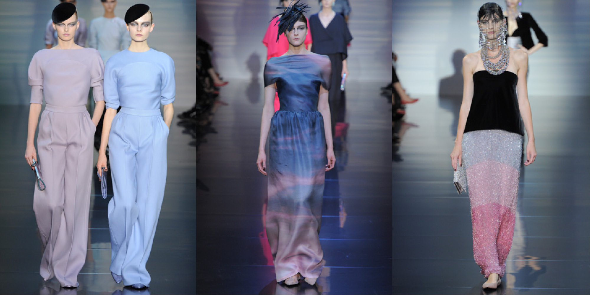 A parade of pale pastel hues accented by black berets, architectural hats made from bird feathers and beaded veils by the master milliner Philip Tracey helped make the statement this season at Armani. No stranger to couture Armani stayed close to home with a collection that was modern and sleek with a subtle elegance.