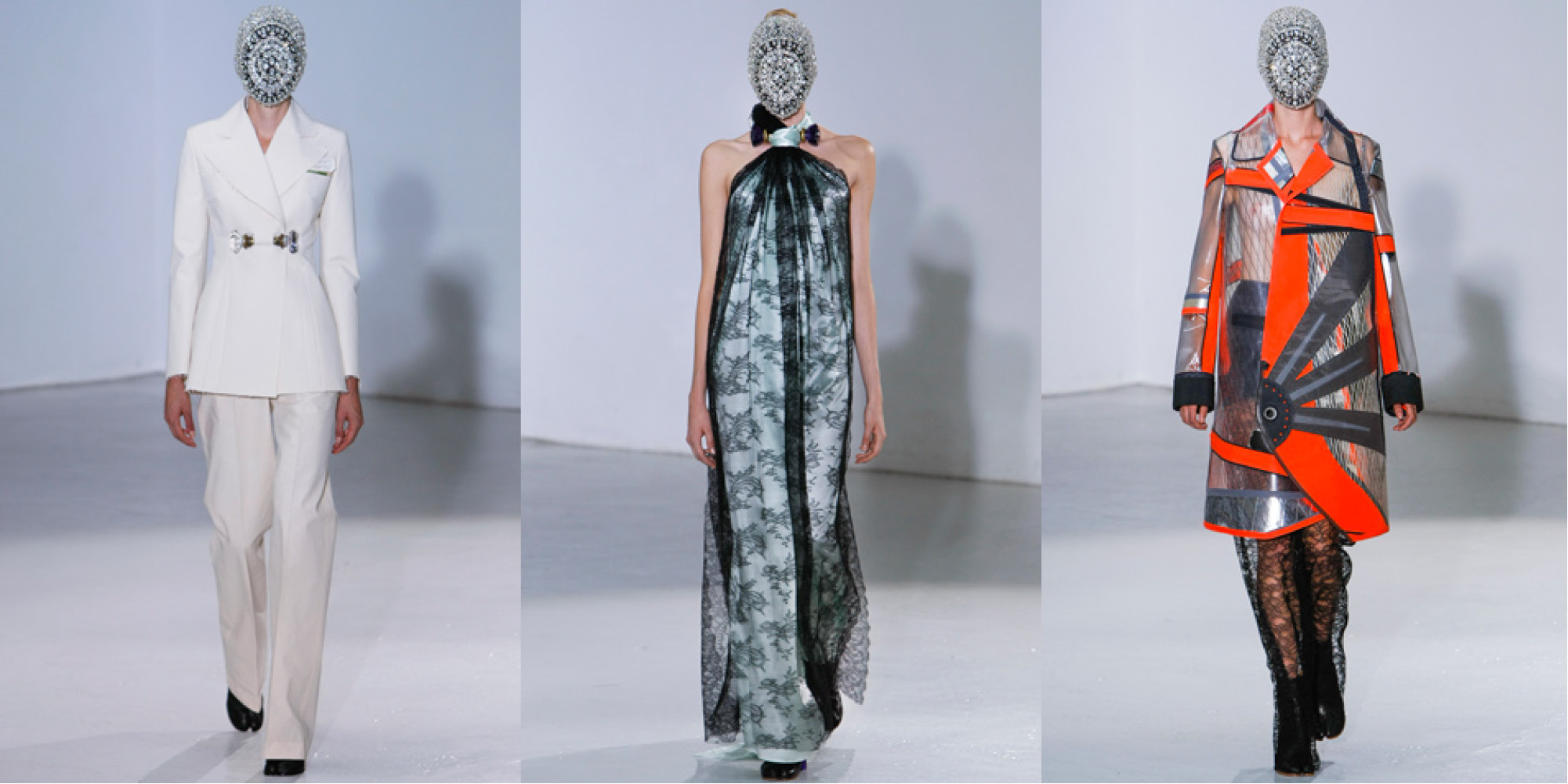They were veiled and beaded in fencing caged headgear at Maison Martin Margiela’s first couture show as Dior’s man of the hour Raf Simons a friend of Margiela, who left the house under a cloud of mystery, sat front row. A homage, to the man himself the collection aptly titled “Artisanal” drew on Margiela’s love for vintage and all things new. Constructed and reworked from vintage pieces the collection’s focus was on the top half of the body paired with straight leg trousers made from French lace. A favorite from the collection were the halter dresses tightly gathered around the neck like nooses with doorknob closures.