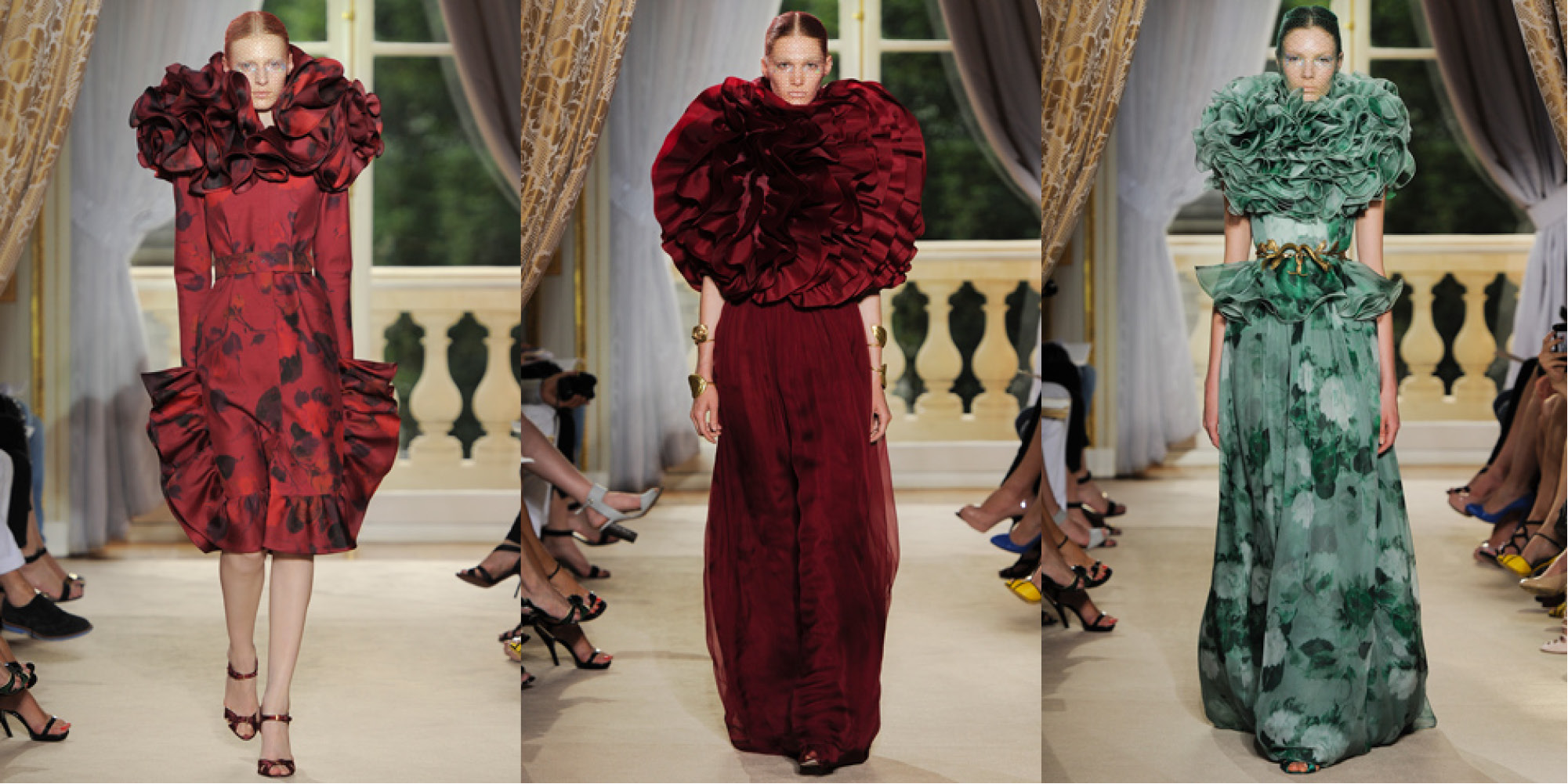 At Giambattista Valli it was a floral corsage filled with rich hues of red and green floral prints, finished with beautiful ruffled and embroidered detail. Valli accessorized each look with veiled tonal netting some with fluttering butterflies capturing the true beauty of the collection.