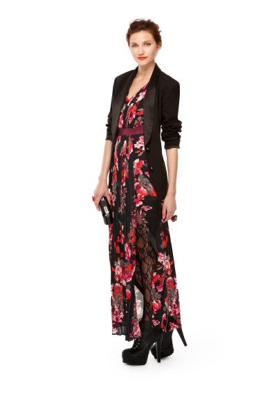 Blazer in Black, $49.99 Maxi Dress in Red Floral Print, $49.99 Lace Tights in Black, $14.99 Hard Case Clutch in Black Patent, $34.99