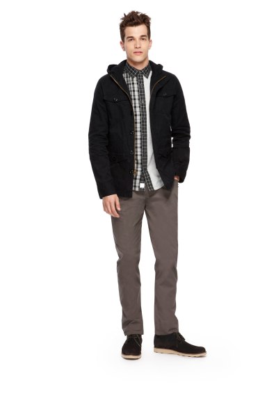 Hooded Parka in Navy, $69.99 Button Down Shirt in Mixed Plaid, $29.99 Canvas Pant in Gray, $34.99 Desert Boot in Charcoal, $44.99