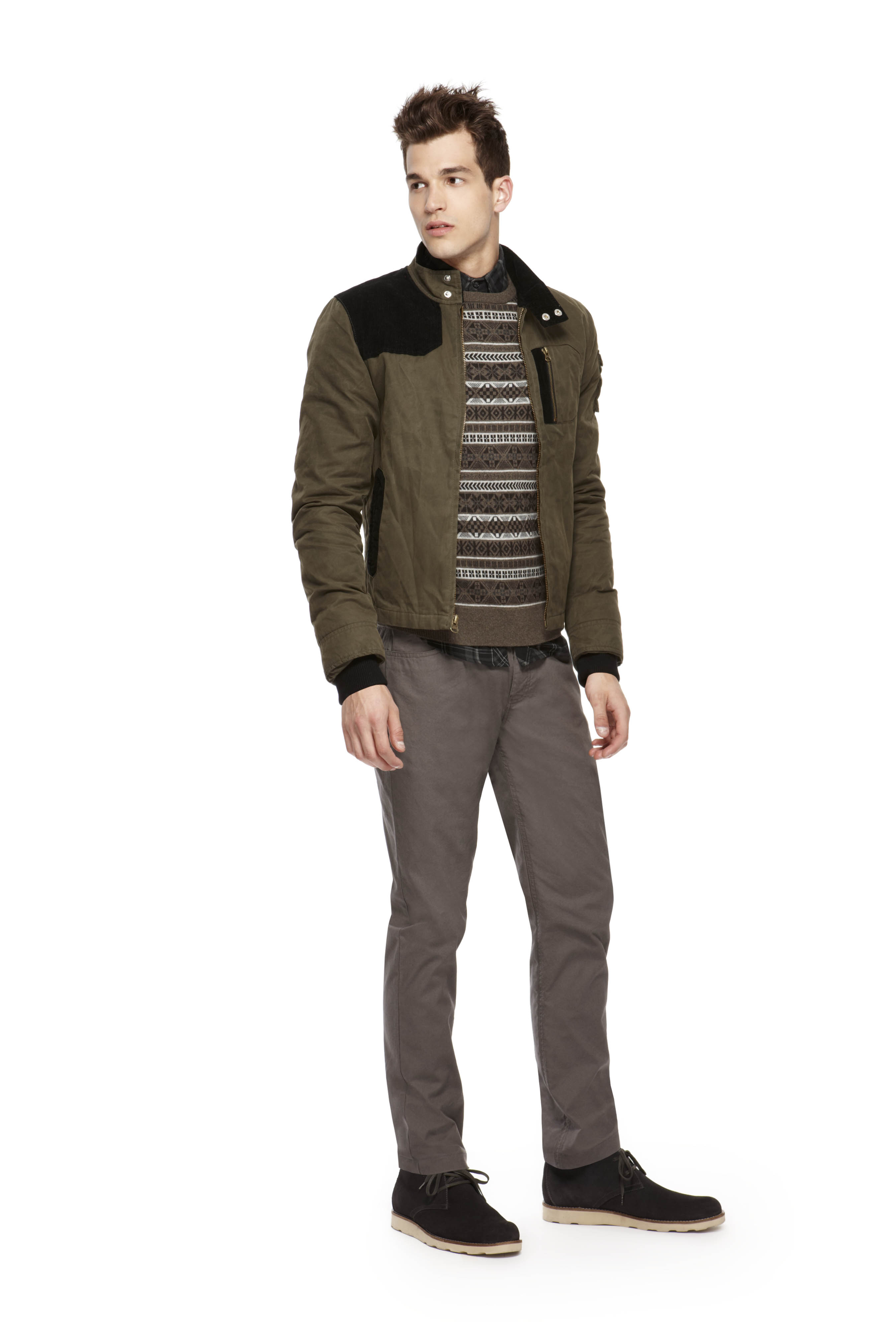 Cropped Jacket in Dark Green, $69.99 Fair Isle Crew Sweater, $34.99 Button Down Shirt in Black Plaid, $29.99 Canvas Pant in Gray, $34.99 Desert Boot in Charcoal, $44.99