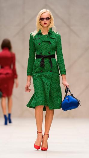 Layers of silk crêpe form an elegant backdrop to the Lace Trench Coat. Woven in an abstract floral design, the dense pattern creates an austere effect. A kickback adds gentle movement and flare to the silhouette, while satin covered buttons and belt give a graphic contrast. Colors Kelly Green and Black, Price $5500, Order ships within 8 weeks. www.burberry.com