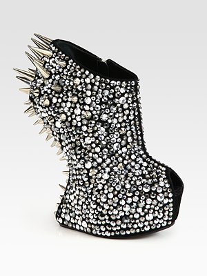 My Look of the Day is Black Suede Peep-toe Booties with a sculpted wedge from Giuseppe Zanotti. These great peep-toe booties with their futuristic design are encrusted with crystal and silver rhinestones and metal studs in a variety of sizes for a sensational effect. The larger spikes on the heel can be replaced with smaller studs, included with purchase. Design elements; heel height 15.0 hidden platform 2” crystal-coated suede upper with metal spikes, side zip, leather lining, leather sole with rubber insert and padded insole. Price $3025.00 available at www.giuseppezanottidesign.com and www.s5a.com