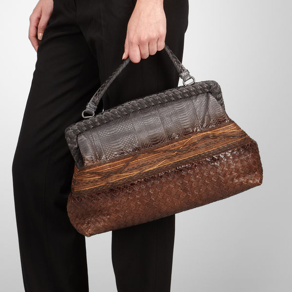 My Look of the Day is the Canyon Shadow Ayers Passamaneria Bag from Bottega Veneta. This exquisite and unique bag combines matte ayers and intrecciato nappato punctuated by the traditional French art of elaborate braided lace trimming known as passamanerie. The hinged frame design allows the handle to be discretely tucked inside coverting this top handle bag into a clutch. Height 15’Wx9.4”Hx4.3”D with interior zip pocket. Price: $5780 www.bottegaveneta.com