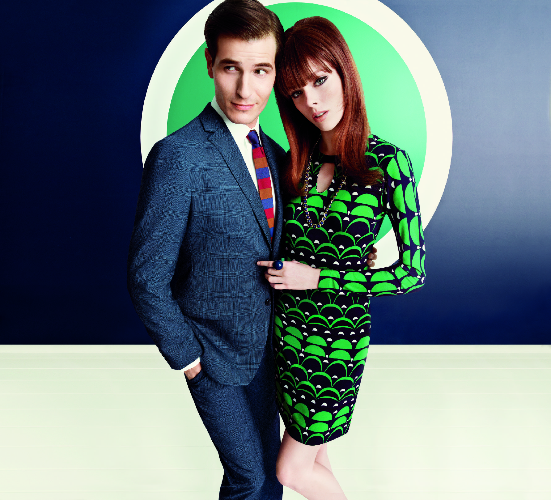 The women’s collection celebrates color, print and pattern in iconic items like the era’s popular shift dress with shorter hemlines, keyhole details, and checked capris. Accessories make a statement with a selection including a mirrored heel shoe, graphic scarves, and geometric jewelry. The menswear collection includes bold plaids and stripes, the emergence of the sport coat, and the sophisticated suit for the boardroom. Fedoras and skinny ties complete the look with a nod to the time period while relating to modern runway trends seen for spring 2013.