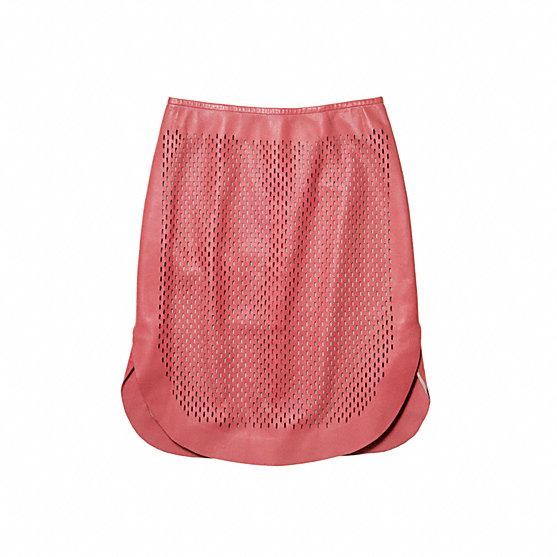 Skirt – Perforated leather pencil skirt with curved hem. Bonded to stretch silk. Perforated leather front panel with flat back. Fabrics: 100% leather bonded to 92% silk, 8% elastane, Color: Fresco, Price: $2490