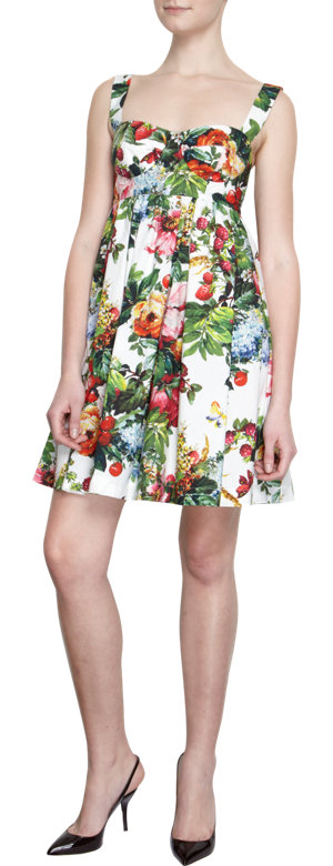 My Look of the Day is the flirty and cute Floral Print Baby-doll Dress from Dolce & Gabbana. A great summer look, this cotton sleeveless dress in multicolored floral print has a bustier top with a ruched back and full all-around pleated skirt that measures 34” in length. Price $1495.00 www.barneys.com