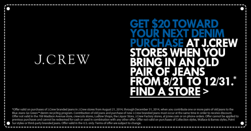To find a participating J.Crew retail location, please visit www.jcrew.com or Madewell store, www.madewell.com www.bluejeansgogreen.org